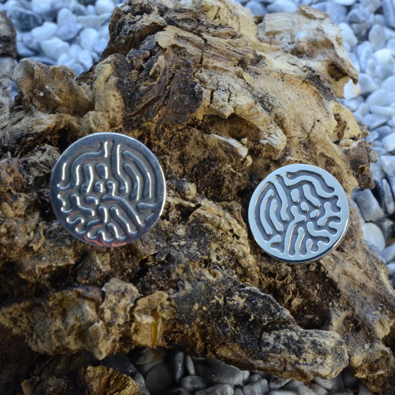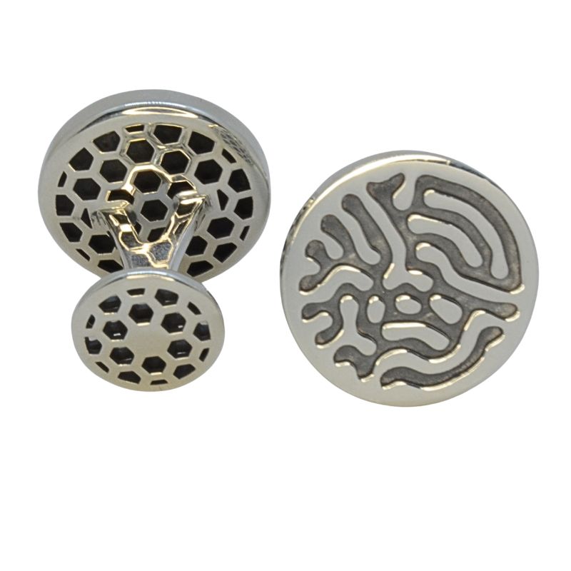 Gemelos de plata con patrones geométricos complementarios. Hechos a mano en edición exclusiva y limitada.